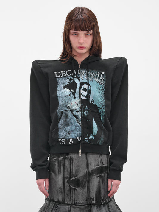 A black relaxed-fit hoodie trimmed with fur and decorated with embroidered patches and diamante embellishments. Removable pin badges and butterfly zip pulls complete the two-way closure.