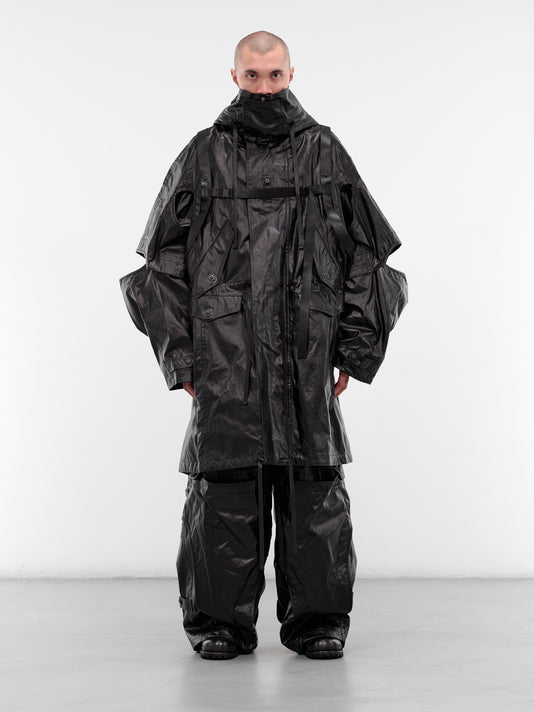 Featuring:• Baggy fit• Cotton-nylon construction with coated finish• Black color• Layering and cut-outs throughout• Belt loops and adjustable cinch straps• Front button and concealed zip fly closure• Side pockets and back flap pockets• Adjustable buckled straps• Paneling and vents along leg• Wide leg silhouette• Made in Japan• 65% Cotton 35% Nylon• Japanese sizing