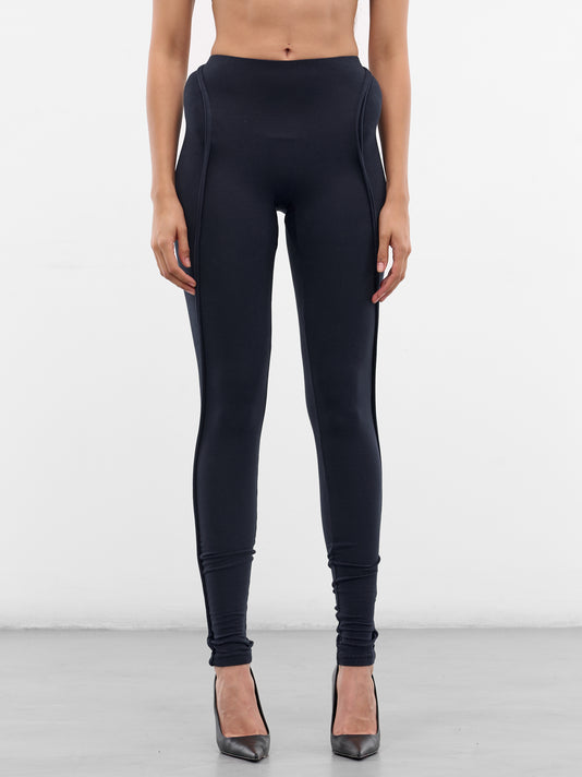 P-Hour leggings in brown bouclé tweed and printed Lycra with a hybrid skirt-over-leggings construction for a layered trompe l’oeil effect.