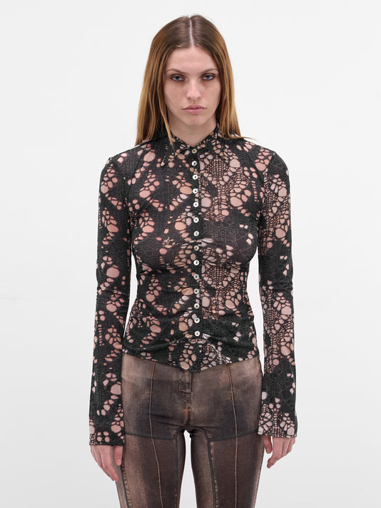 Featuring:• Slim fit• Trompe l’oeil Lycra print• Spread collar• Front button placket closure• Long sleeves• Main: 78% Polyamide 22% Elastane• Standard sizing