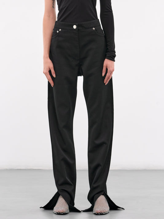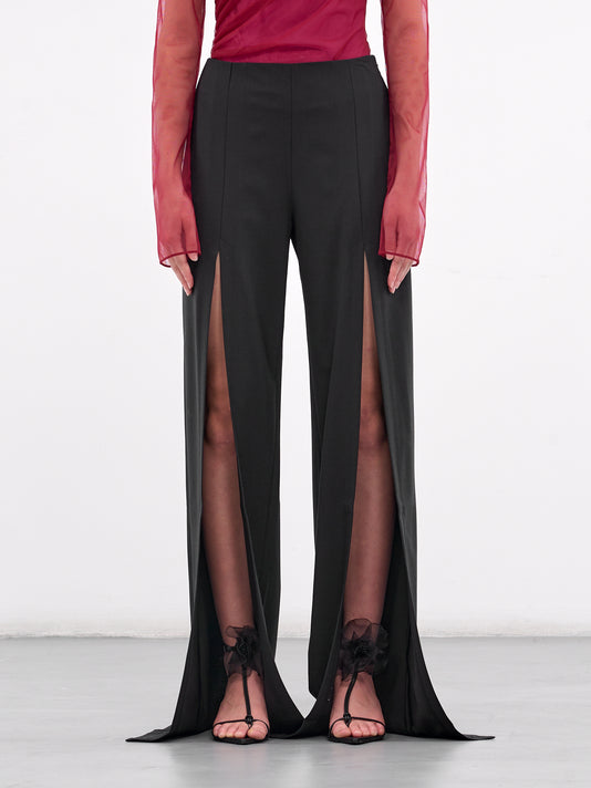 These black tuxedo fuseau trousers feature high-waisted construction with side tuxedo stripes. The tapered leg includes cuff slits and a traveler's crease for refined detailing.