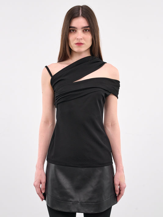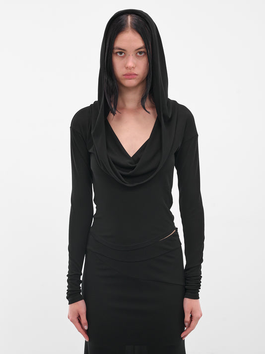 This black tasselled cowlneck top features a halterneck design with back tassel detailing. The front cowl neck drapes elegantly above the partially open back, finished with a curved hem.