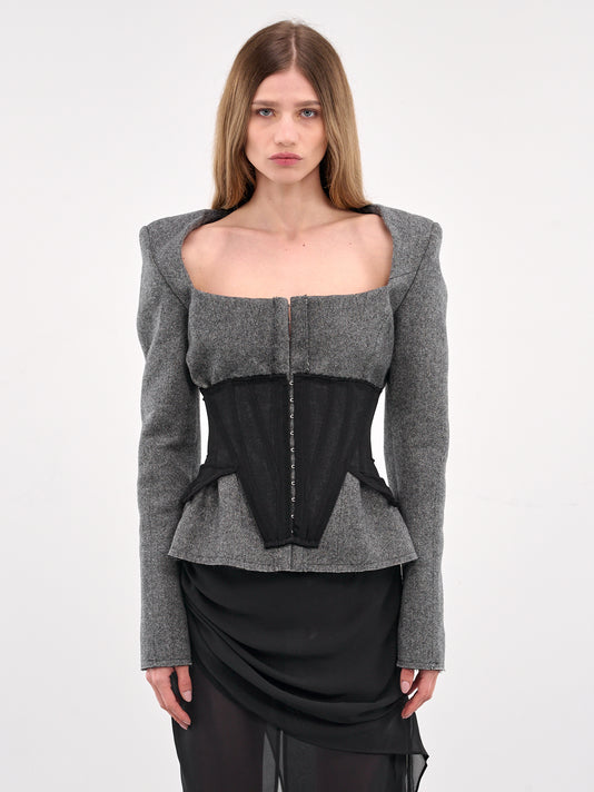 Featuring:• Slim fit• Round neck• Long sleeves• Structured bust with corset-style boning• Sheer paneling with back cut-out• Back zip closure• Cropped length• Made in Albania• Main: 92% Viscose 8% Elastane | Contrast: 84% Polyamide 16% Elastane• Italian/Standard sizing