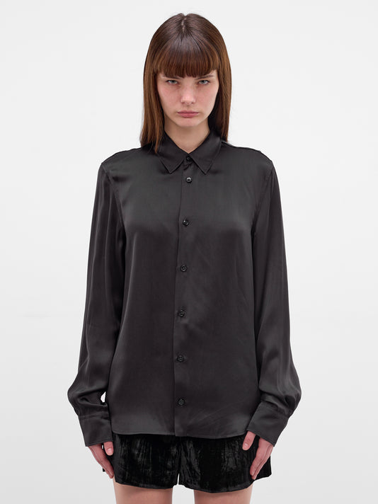 Forest asymmetrical oversize shirt in fluid satin with pointed collar, wrap-style front closure, and draped hanging shoulder panel at side.