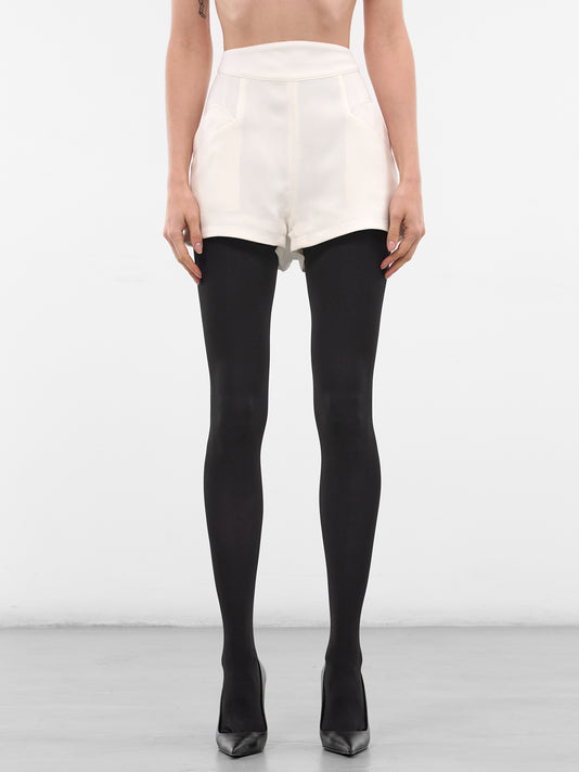Black mini shorts in viscose-wool blend with high waist, concealed back zipper, and side flap pockets.