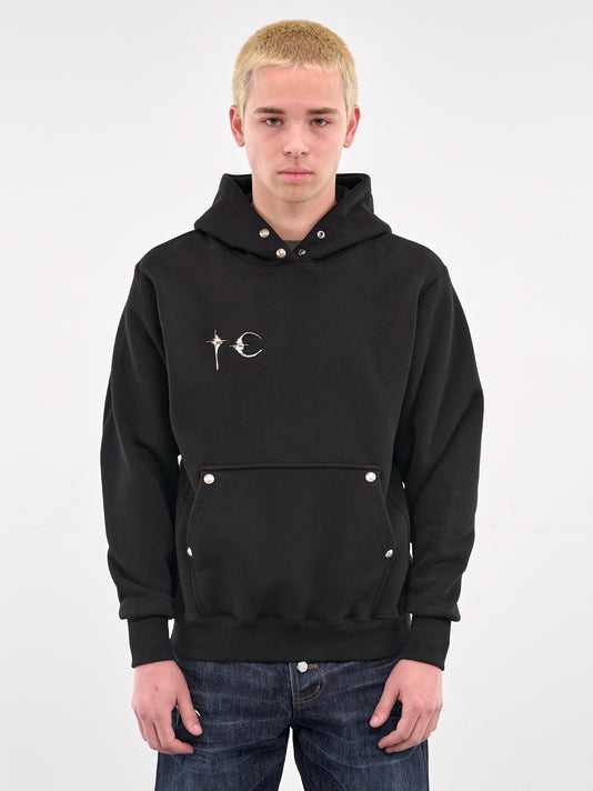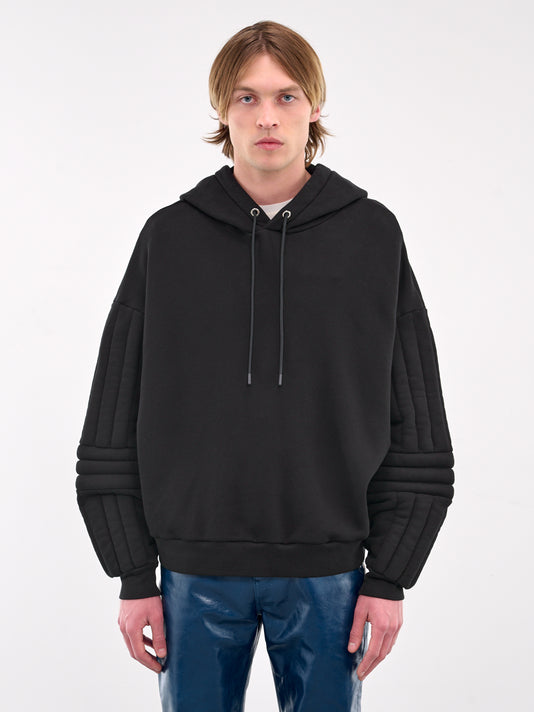 This black zip-up hoodie is designed with a modern, structured silhouette. The clean lines and boxy fit make it a refined take on a classic wardrobe staple.
