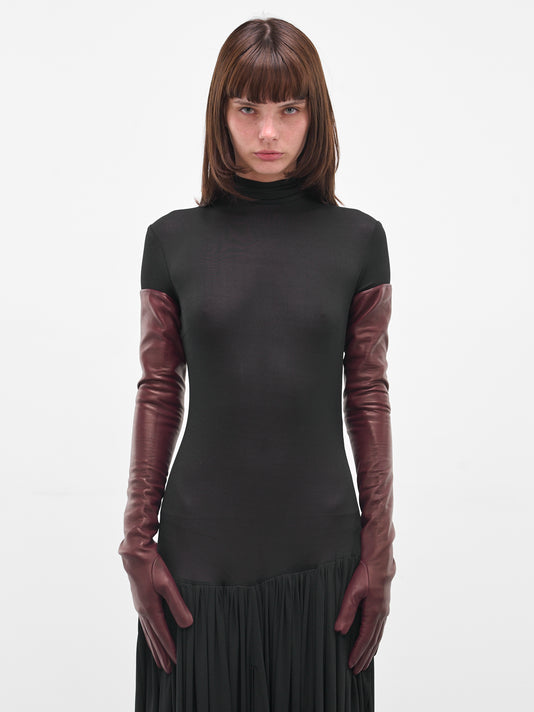 Black mid-length gloves in soft Nappa sheepskin with a cashmere lining for added warmth. A five-finger construction complements the streamlined silhouette.