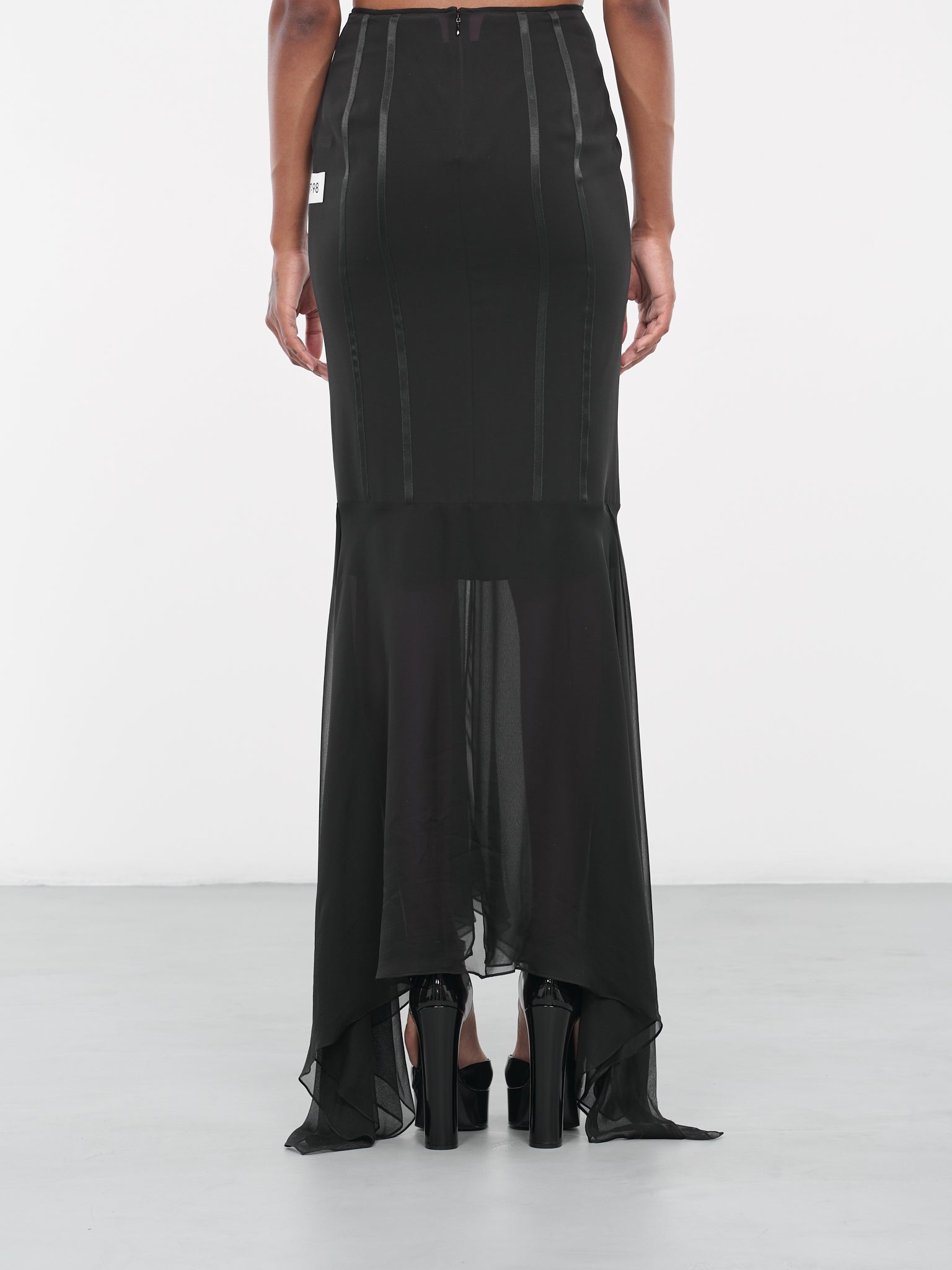 DOLCE & GABBANA skirt in black, ruffled mermaid design, semi-sheer, mid-waist, back zip & hook eye closure, stretch silk crepe slip, maxi length, slim fit.