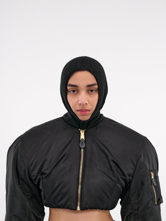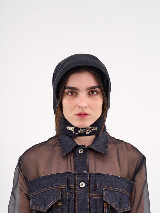 Black cotton knot cap with a short curved brim. Detailed with back knot self-tie fastening and adjustable bungee cord.