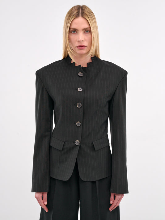 Navy pinstripe blazer with a sculptural silhouette. Defined by twisted and layered draping with raw hems and warped flap pockets.