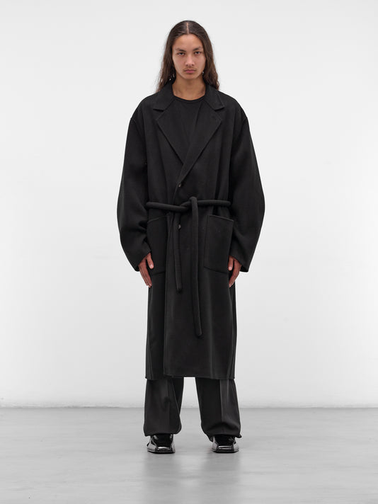 Black reversible graphic padded coat in tailored fit with quilted construction, detachable wool liner, notched lapel, and structured shoulders.