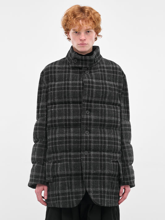 Wool Harrington jacket in plaid check with dropped shoulders and concealed placket closure, lined throughout.