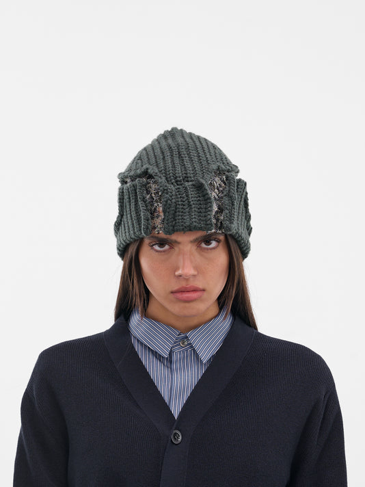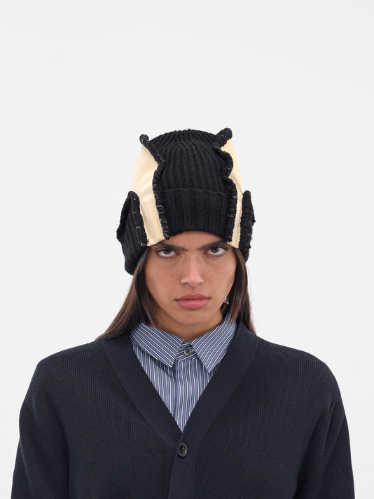 Black hat in a wool-silk knit with a jacquard triangle pattern, ribbing and fringe embellishment for textured contrast.