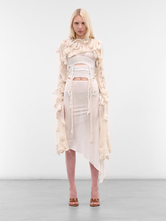 White shrug constructed in bamboo silk satin with sculptural gathering and open structure.