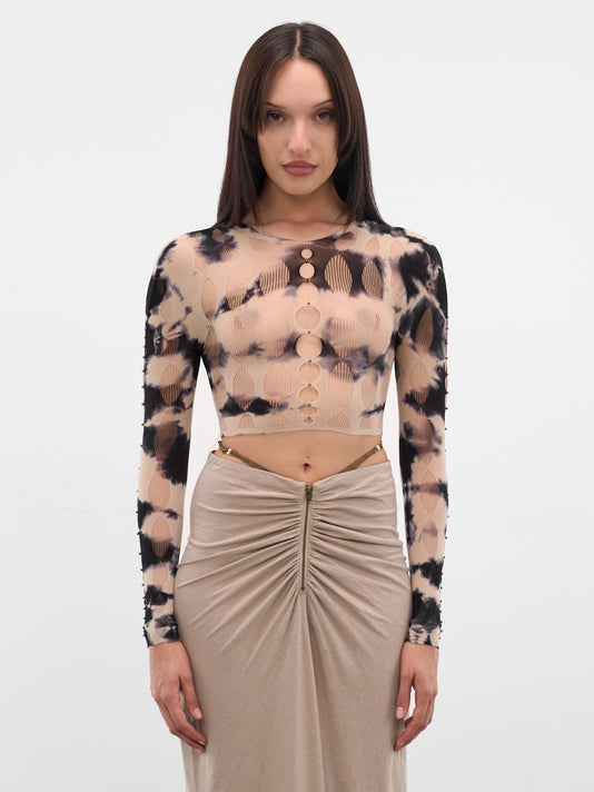Featuring:• Slim fit• Layered semi-sheer construction• Signature cut-outs and beaded embellishment throughout• Crewneck• Elongated sleeves with thumb loops• Bandeau top underlayer• Made in China• Outer: 95% Polyamide 5% Elastane | Bandeau: 61% Viscose 39% Polyester• Numeric sizing
