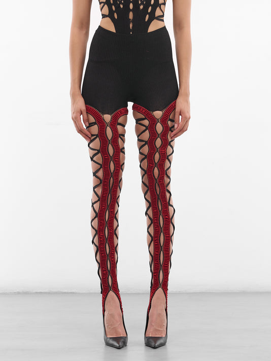 Black nylon-lycra tights with cut-out squiggle knit detailing.