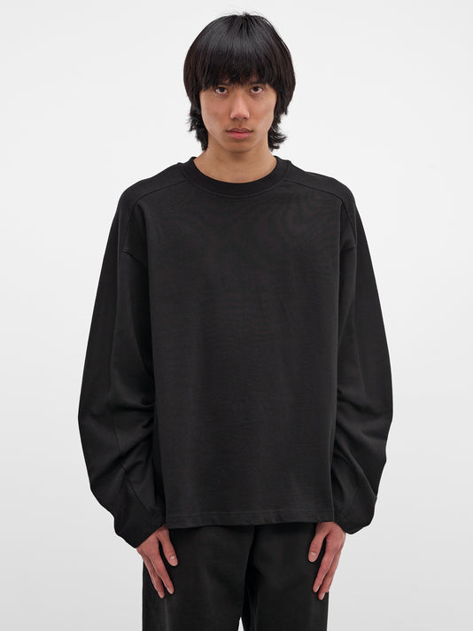 Black heavy cotton t-shirt with washed and faded finish and long sleeves.