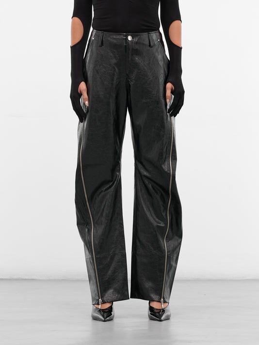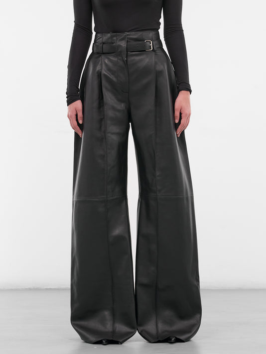 A sharp, reinterpreted take on the trousers in black soft leather, the relaxed wide-leg silhouette is accented by oversized silver-tone stud embellishments running down the side seams.