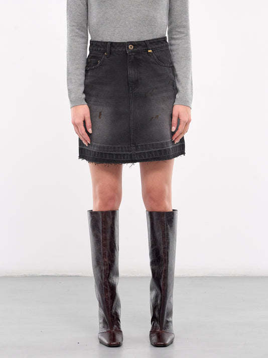 This black denim mini skirt features a deconstructed upside-down design with an inverted waistband and pockets. The unconventional construction creates a subversive take on classic denim through the slim silhouette.